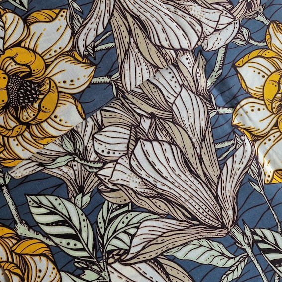 Sonniges Gelb trifft auf lebendiges Blumenmuster: Yellow Flowers bringt Frische und Gute-Laune-Vibes in jedes Nähprojekt. Der Ankara/Wax Print aus 100 % Baumwolle ist hautfreundlich, formstabil und überzeugt mit intensiven, farbechten Prints – perfekt für Mode, Accessoires und Home-Deko.