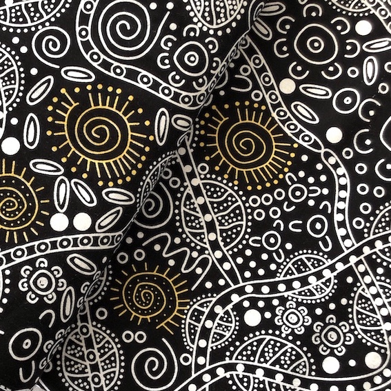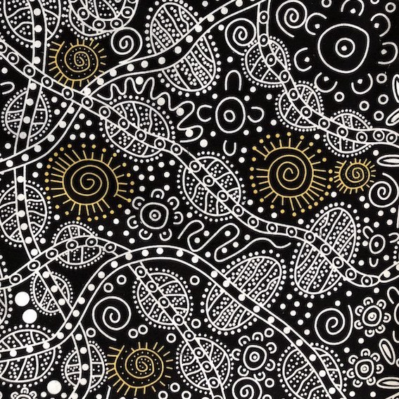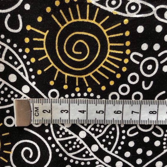 Der Bush Tucker Aborigines Stoff ist ein hochwertiger, feiner Baumwollstoff mit einem einzigartigen Design, das die kulturellen Wurzeln der Aborigines widerspiegelt. Jedes Muster erzählt eine Geschichte der Traumzeit, entworfen von talentierten Aborigines KünstlerInnen.