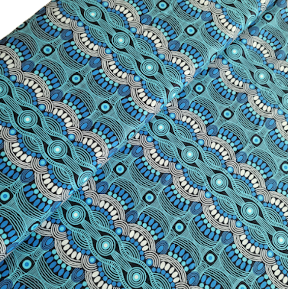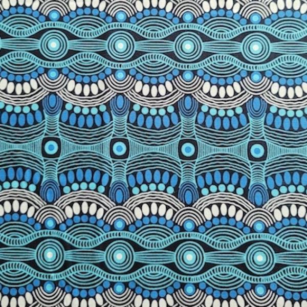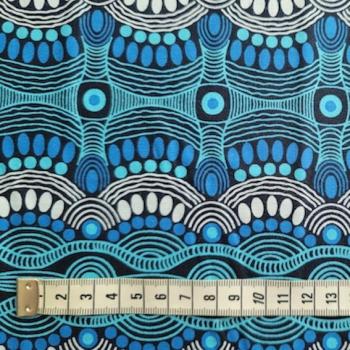Bringen Sie mit dem DESERT FLORA BLUE Stoff die Kunst der Aborigines in Ihre Designs – jetzt exklusiv im ETHNOstoffe Onlineshop erhältlich!