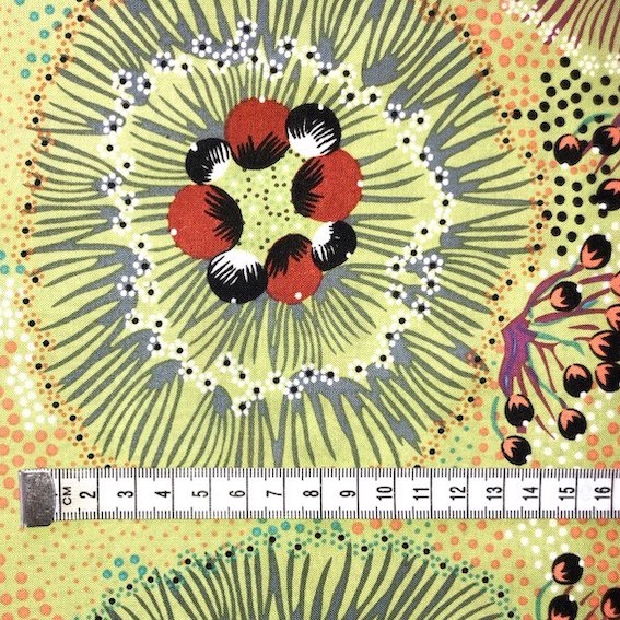 Entdecken Sie den Lime Bush Plum Aborigines Stoff aus Australien – ein hochwertiger, feiner Baumwollstoff mit einzigartigem Aborigines-Design. Jedes Motiv ist ein Kunstwerk, das eine Geschichte aus der Traumzeit erzählt, entworfen von talentierten Aborigines KünstlerInnen.