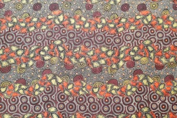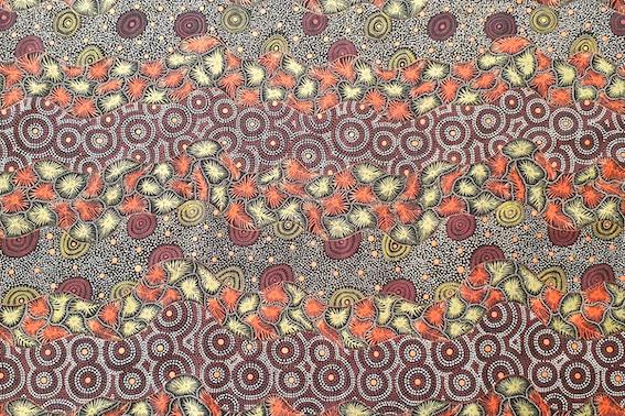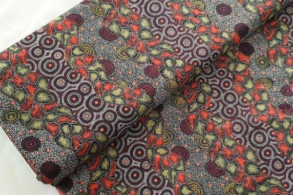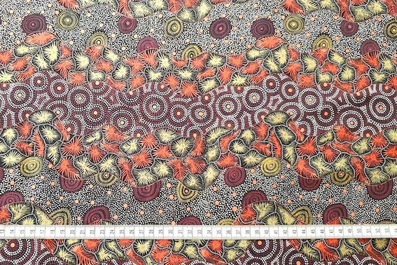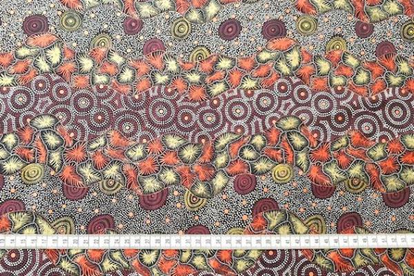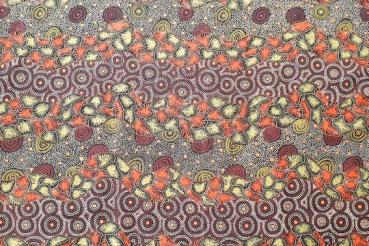 Entdecken Sie den RED WILD SEED & WATERHOLE Aborigines Stoff aus Australien – ein hochwertiger Baumwollstoff mit einem einzigartigen Design, das von Aborigines KünstlerInnen entworfen wurde. Jedes Muster erzählt eine fesselnde Geschichte der Traumzeit und lässt sich als wahres Kunstwerk bezeichnen.