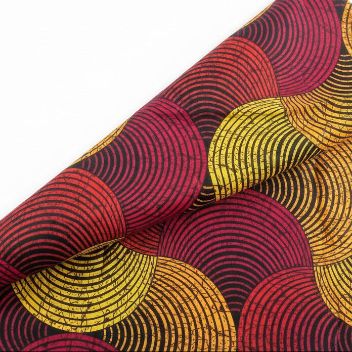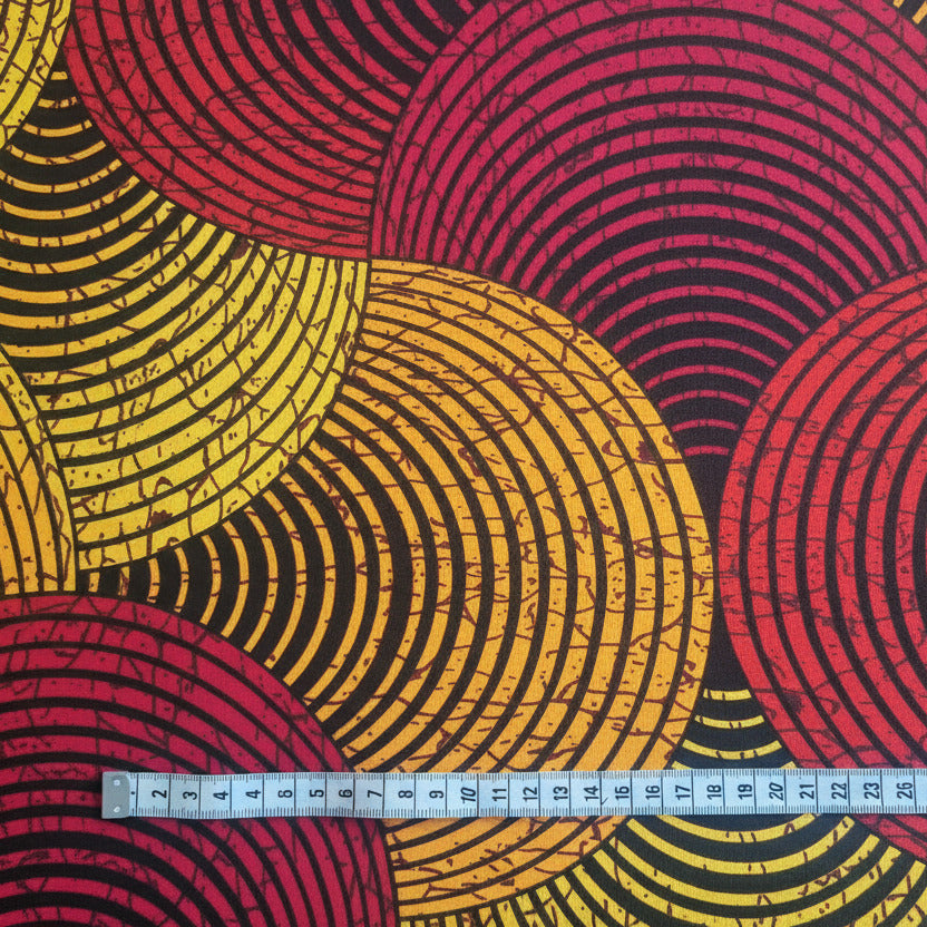 Lebendiger afrikanischer Wax-Print aus 100 % Baumwolle mit dynamischem Kreismuster in Rot, Orange und Gelb. Dieser hochwertige Ankara besticht durch intensive Farben, ausgezeichnete Haltbarkeit und hautfreundliche Eigenschaften. Ideal für farbenfrohe Designs wie Kleider, Röcke, Hemden und Accessoires sowie für dekorative Heimtextilien. Das moderne Kreismotiv bringt Energie und afrikanischen Flair in jedes Projekt. Meterweise zuschneidbar – angepasst an Ihre individuellen Bedürfnisse.