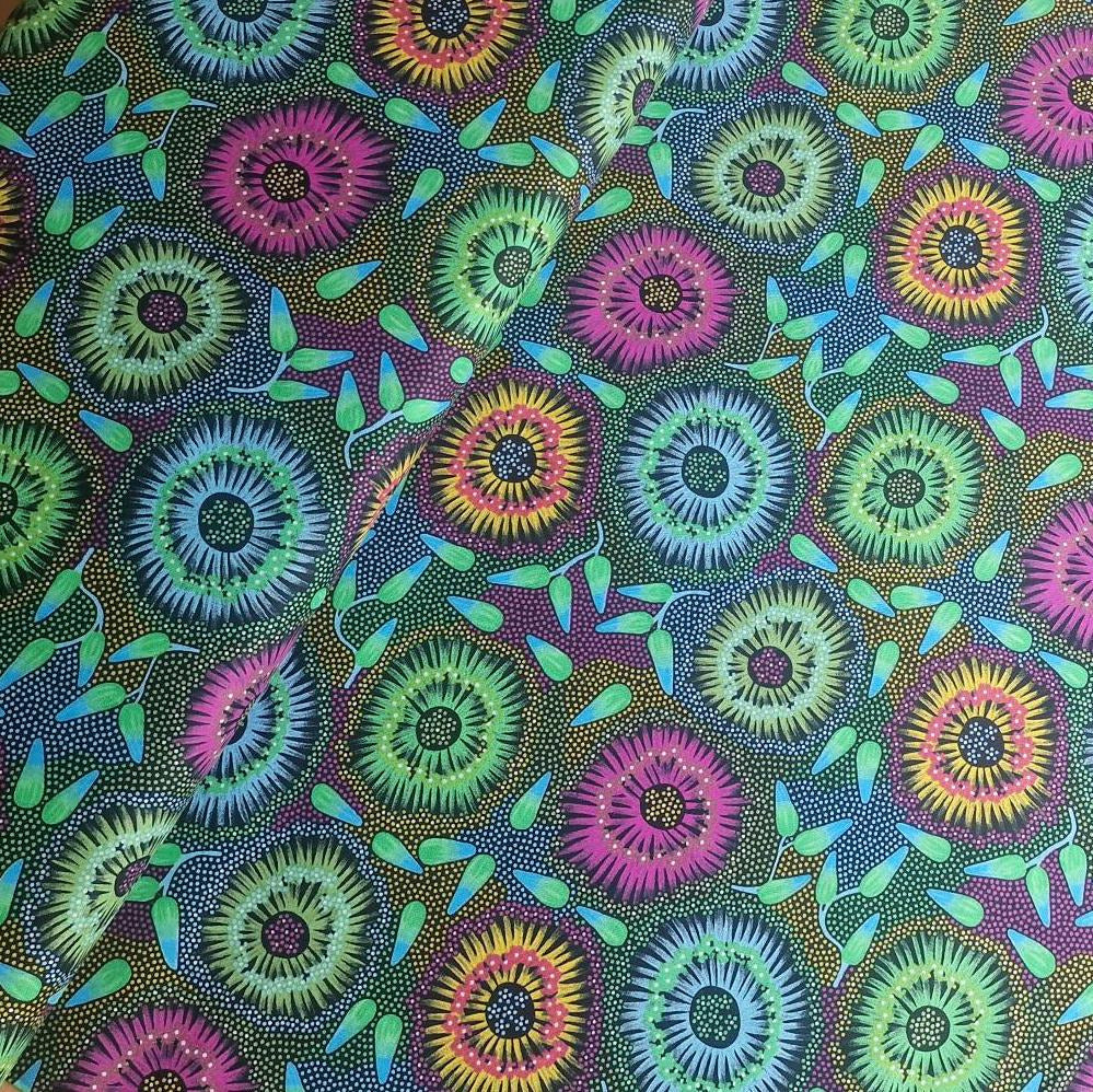 Authentischer Aborigines-Stoff aus Australien mit traditionellem "Wild Bush Banana Green"-Muster. Diese hochwertige Baumwollmeterware besticht durch lebendige Farben und kulturelle Handwerkskunst. Das Design verbindet zeitlose australische Kunsttradition mit modernem Textildesign – ideal für Patchwork, Heimtextilien und kreative Nähprojekte. Feinste Baumwollqualität für langlebige und farbbeständige Ergebnisse. Verkauft nach Meter mit flexiblen Zuschnittsmöglichkeiten.